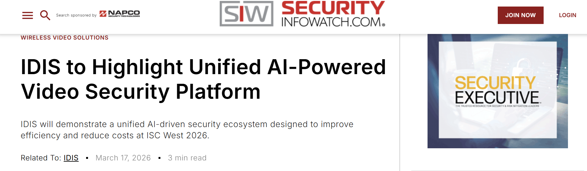 IDIS has been featured by SecurityInfoWatch, highlighting its unified AI-powered video security platform.